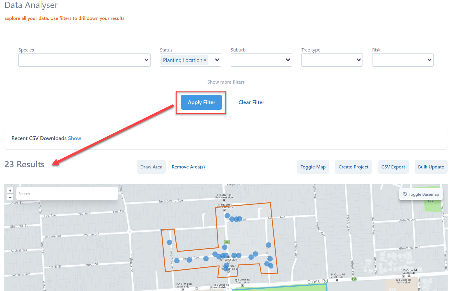 Once you have drawn the project area and selected any filters you want, make sure you click the blue Apply Filter button so the planting locations filter to the area: