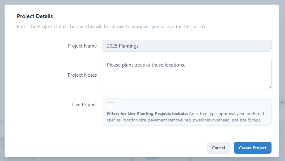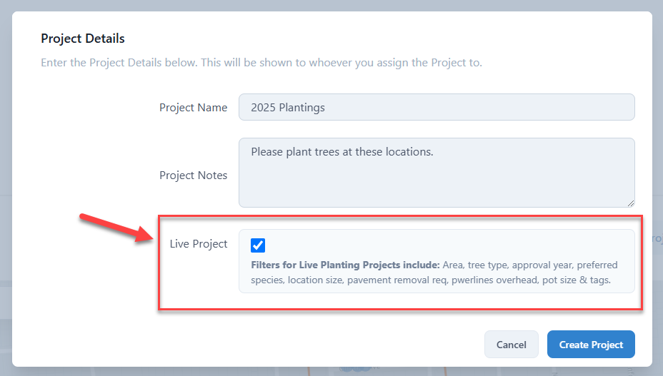 You also have the option to create a LIVE Planting Project. This means that if you add or change any planting location and they meet your filter criteria, they will automatically be shown within the Live Planting Project.
