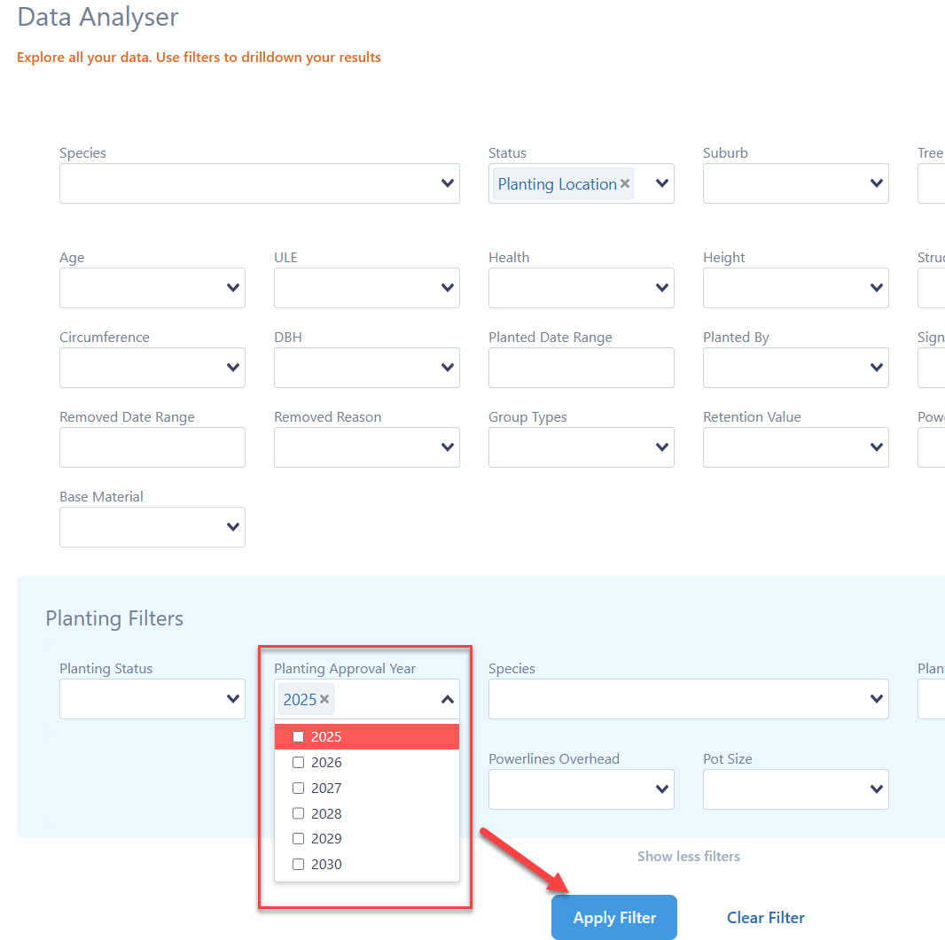 For example, if you want to show all Planting Locations that have been approved for 2025, you can use the filters in the Data Analyser: