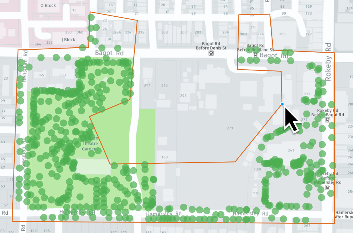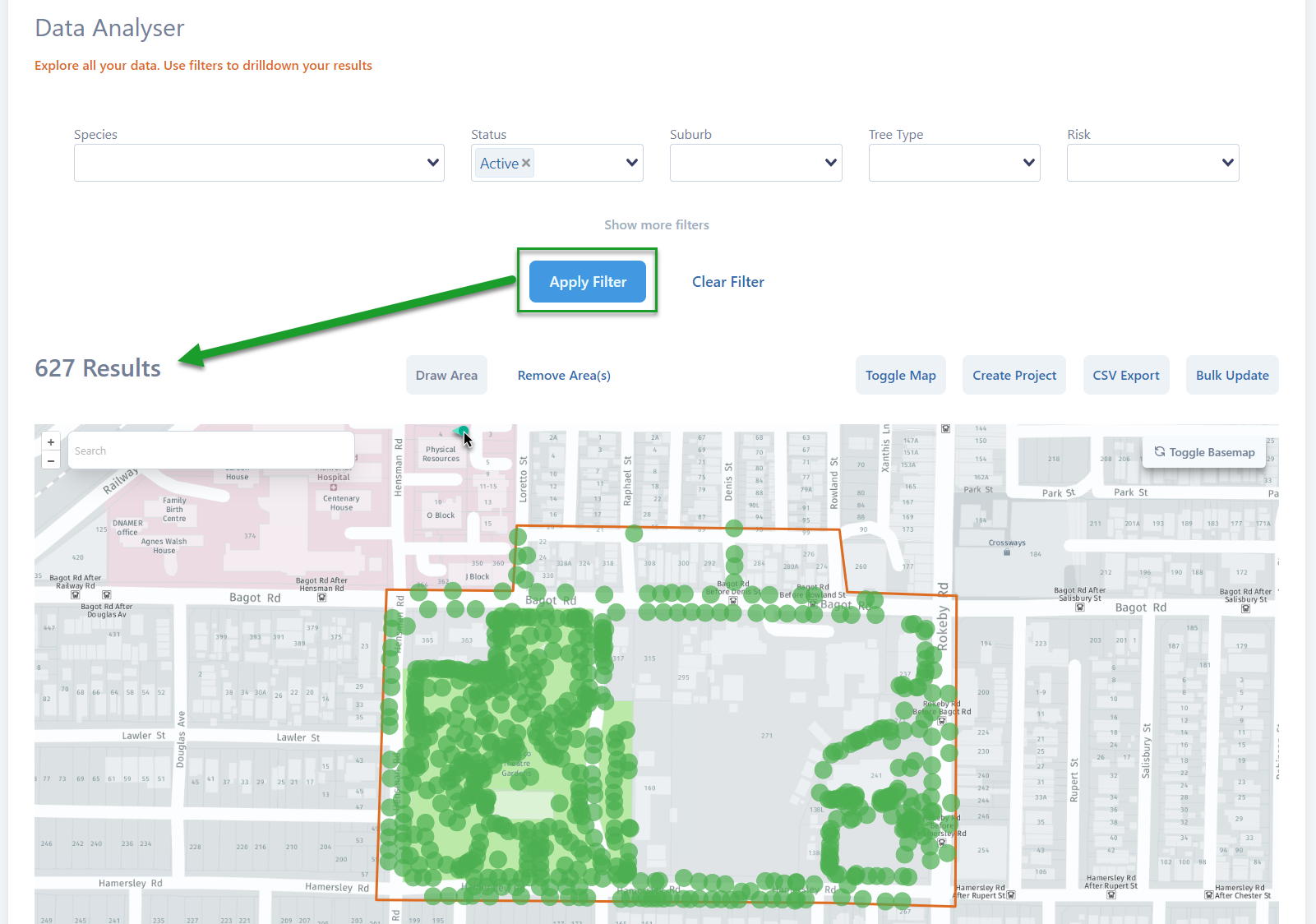 Once you have drawn the project area and selected any filters you want, make sure you click the blue Apply Filter button so the trees filter to the area:
