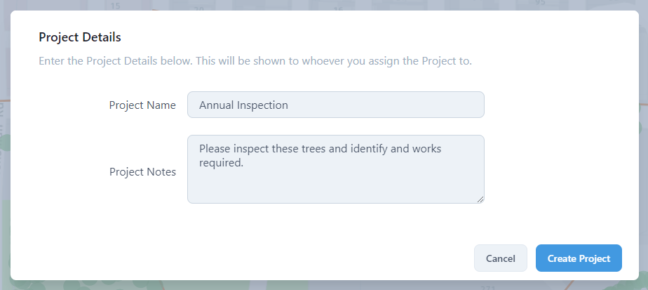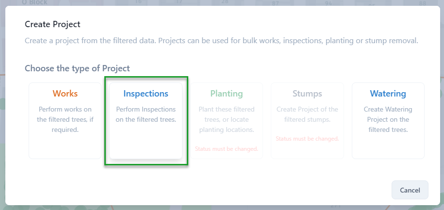 An Inspections Project lets you select trees through the Data Analyser or the Scheduled Inspections list and assign to a user or contractor to be inspected. A few examples for a Inspections Project are:
