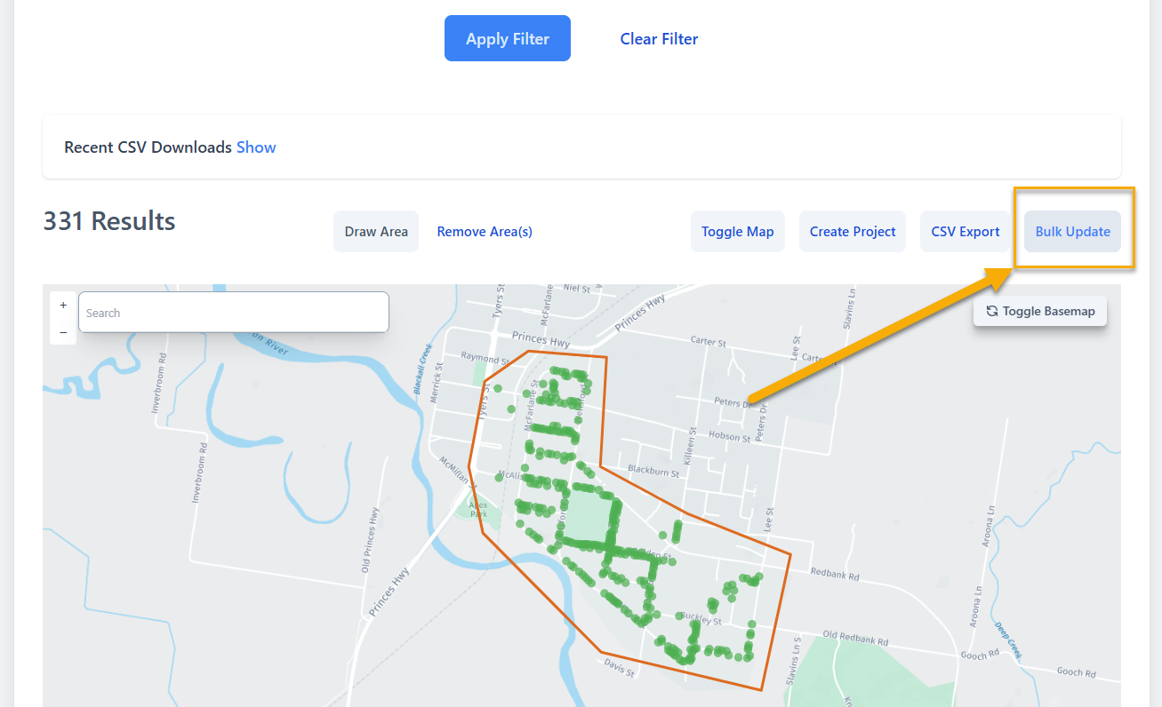 - Filter down the trees you want to update using the filters and polygon tools. See Data Analyser Support Page for more information.